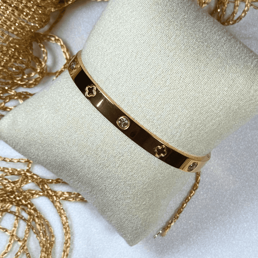 18K Gold Plated Crystal & Clover Hinged Bangle - Samira (Waterproof)
