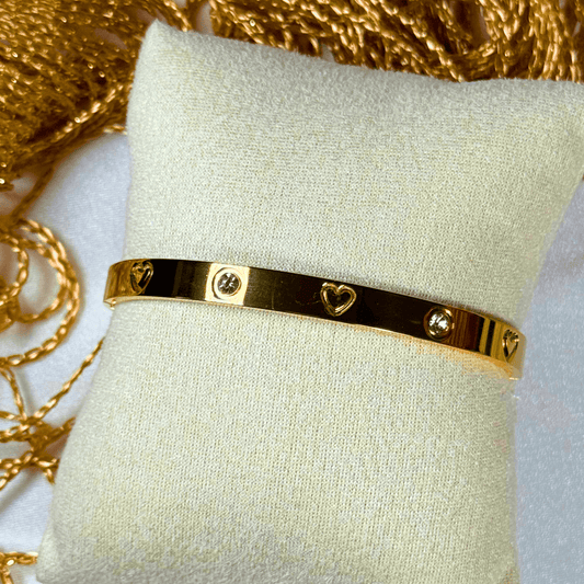 18K Gold Plated Crystal & Heart Hinged Bangle - Masha (Waterproof)