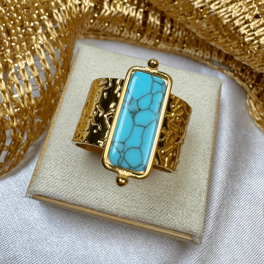 18K Gold Plated Hammered Turquoise Bar Ring - Aramis (Waterproof)