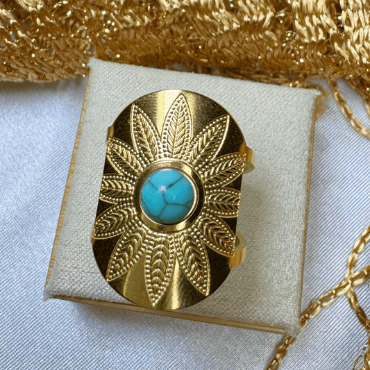 18K Gold Plated Turquoise Palm Leaf Shield Ring - Oriana (Waterproof)