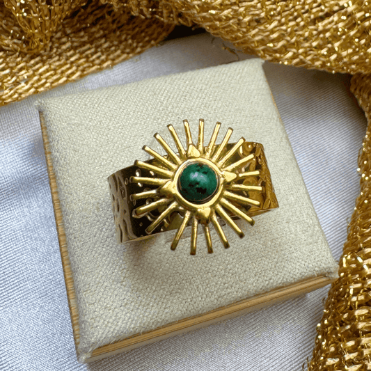 18K Gold Plated Wide Sunburst Green Stone Ring - Jamila (Waterproof)